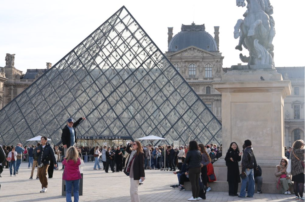 2025年10月22日,在法国巴黎,大量游客聚集在卢浮宫博物馆的玻璃金字塔入口前。新华社记者张百慧摄